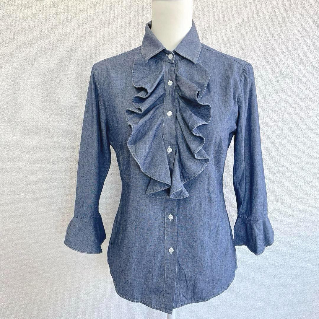 フロントのフリルと袖のフレアベルスリーブがポイントの大人カジュアルに最適なダンガリーデニムシャツです♪